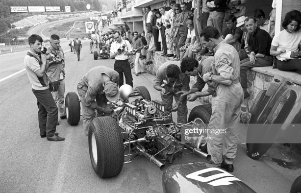Lorenzo Bandini being attended to in the Spa pits during the June 1964 Belgian Grand Prix weekend.
