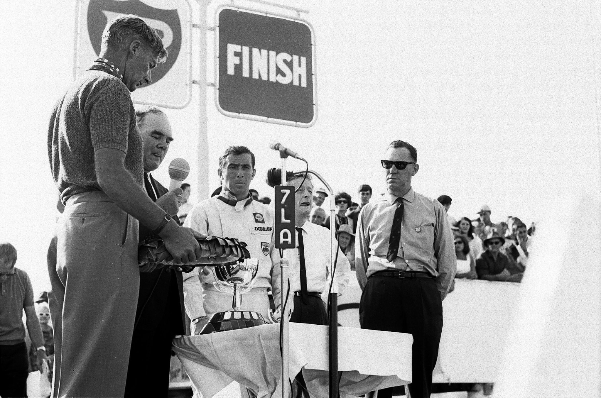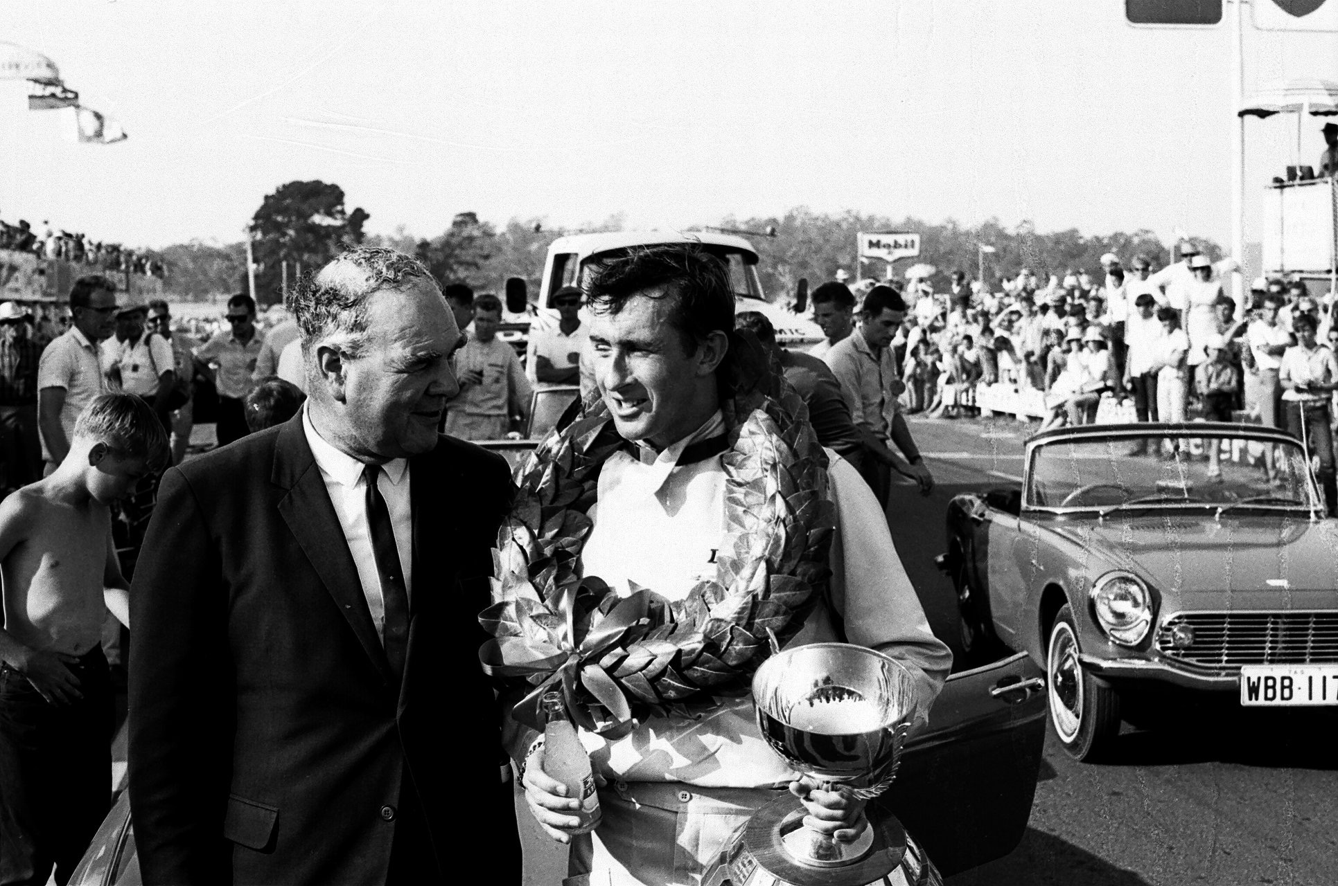 Frank Matich, left and Rocky at Warwick Farm during the Hordern Trophy meeting in December 1964 (autopics)