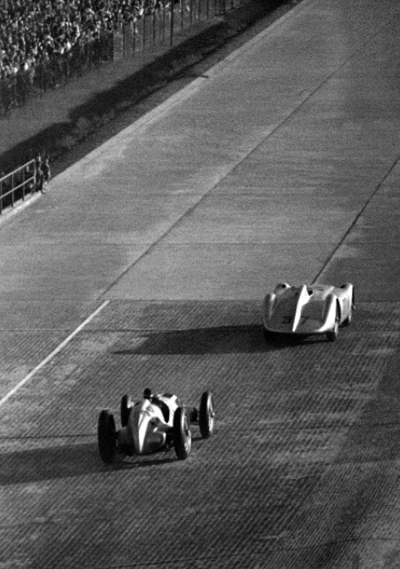 Caracciola this side in Mercedes W125 and Rosemeyer Auto Union Type C (Ullstein Bild)