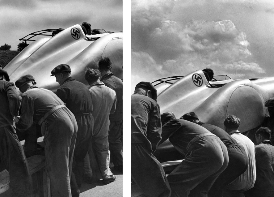 Von Brauchisch’ big Benz 1936 W25 with 700bhp DAB V12 and Lang 1936 LWB speed record W25 5.7-litre Straight-8 ahead of one of von Delius or Hasse AU Type C open-wheeler 6-litre V16 (Heritage Images)