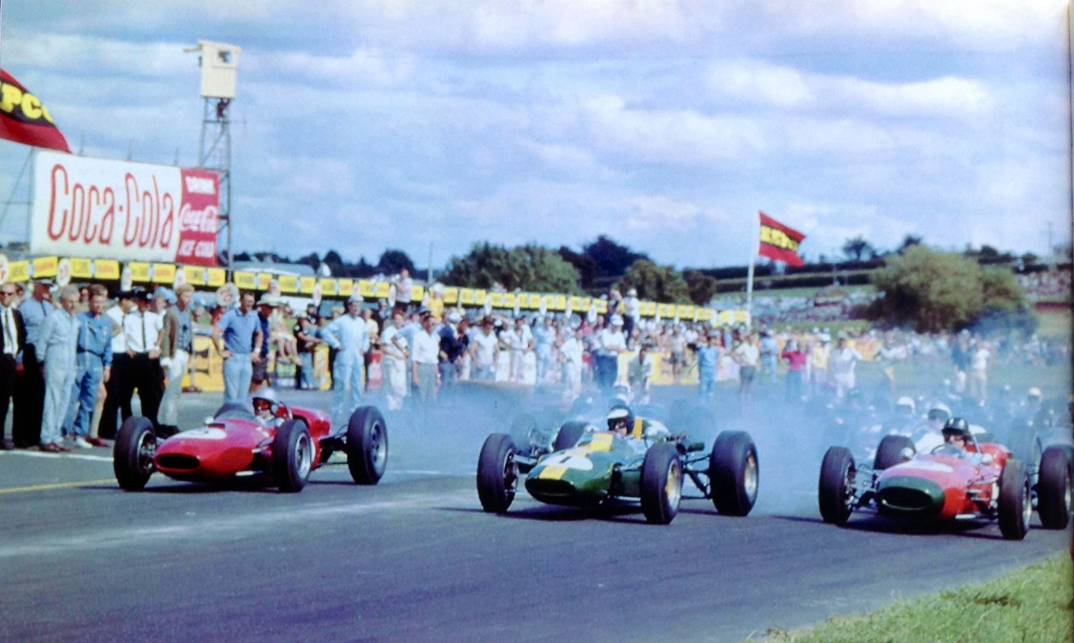 He may not have been the youngest driver in the field but Davo could still make a car dance; here left on the front row in Brabham BT4 alongside Clark’s Lotus 32B and Hills Brabham BT11A, NZGP Pukekohe 1965 (Jack Brabham with Doug Nye)