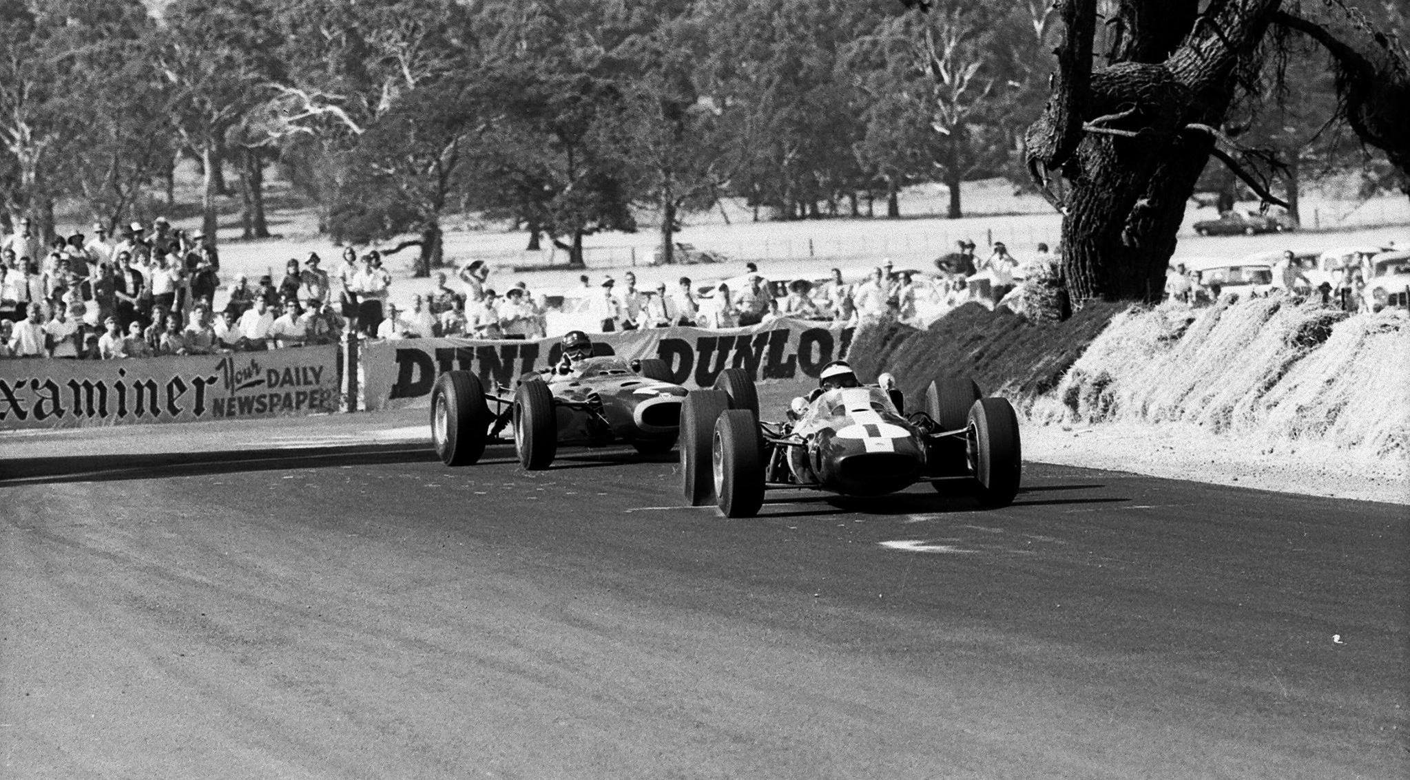 Brabham accelerates away from Mountford in BT19, surely the most photographed single-seater in 1966- Brabham’s weapon in Tasman and GP competition pretty much all year.