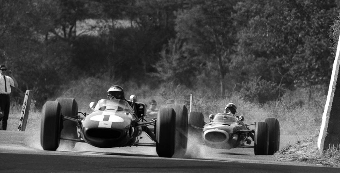 Jim Clark, Lotus 39 Climax in front of his fellow Scot at The Viaduct in 1966 (oldracephotos.com.au/DKeep)