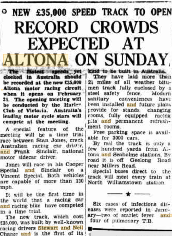 Before the opening meeting the Williamstown Chronicle described the circuit as the first of its type in Australia, the Charges ‘have laid more than 2 1/4 miles of all weather bitumen fully enclosed by a steel safety fence…future plans provide for stands, changing rooms, fully equipped racing pits and permanent refreshment rooms’. The opening included a novelty match race between Jones Cooper and F Sinclair’s Vincent Spl sidecar, its not reported who won!