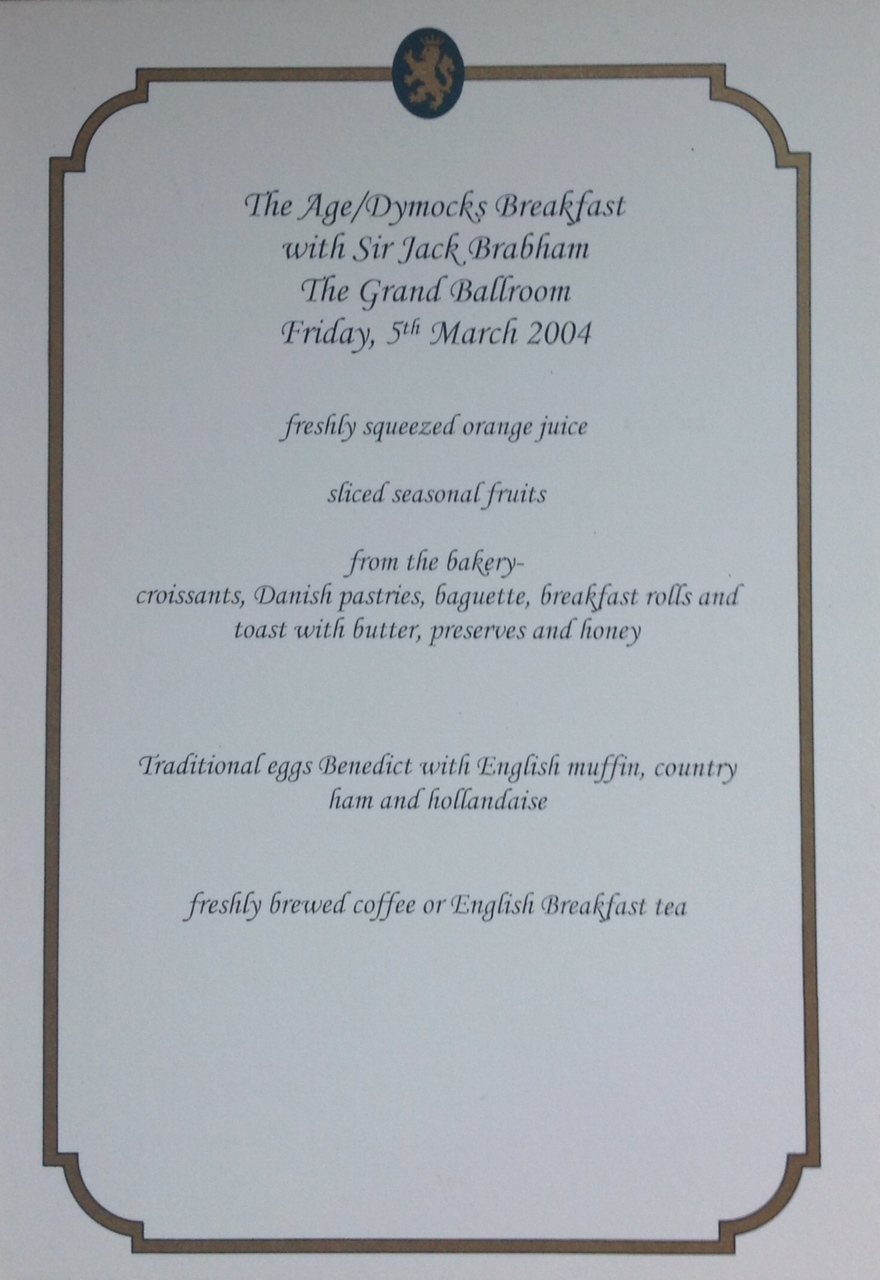 JB publicised ‘The Jack Brabham Story’ in Melbourne shortly after it was published and in the Friday before the 2004 AGP. He spoke at a function at the Windsor Hotel, the book was sold after the event and autographed by the champ for those prepared to stand in a long queue. My youngest son was 8, the only kid amongst 300 businessmen at the breakfast.