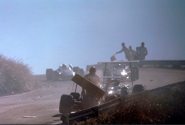 Dick Simpson’s shot was taken at precisely the same time as John Arkwright’s (look at Max in each shot) albeit a bit further down the mountain. Its Leo Geoghegan’s Lotus 39 Repco framed by Allen’s wing with Glynn baring down on the action on the left and about to become a part of it.