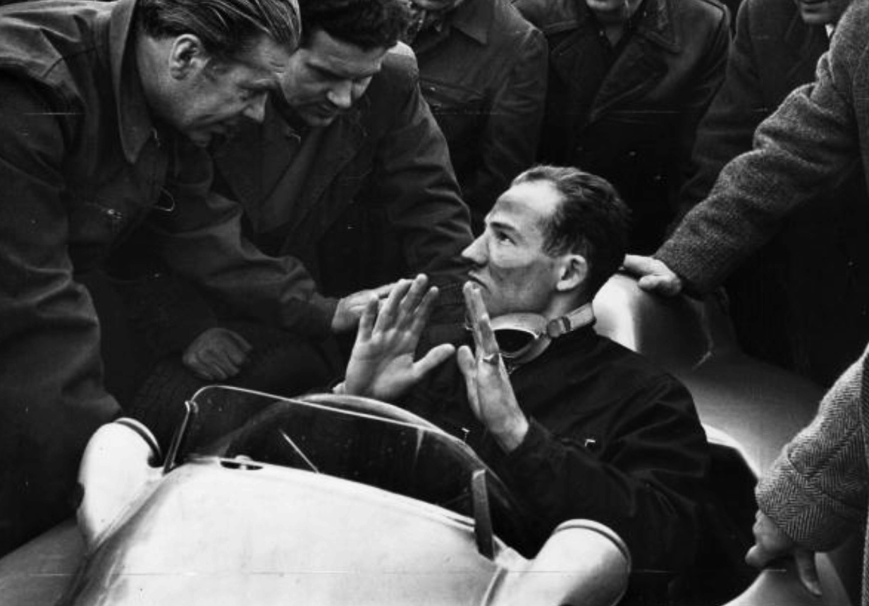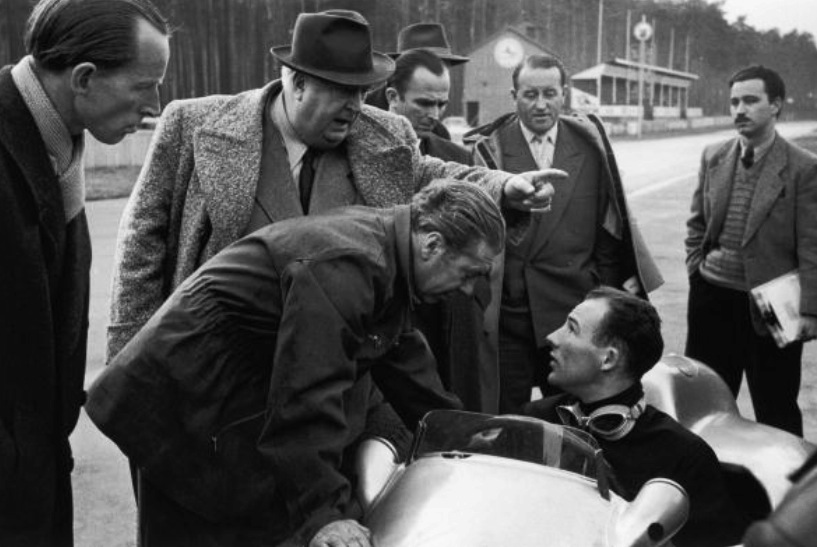 British GP practice, Silverstone 1969 with Surtees telling the boss just how shite things really are! Sir Alfred Owen, the immensely successful industrialist listens carefully and acts, with ‘generational change’ at Bourne. Allan Challis is the BRM mech in orange (Rainer Schlegelmilch)