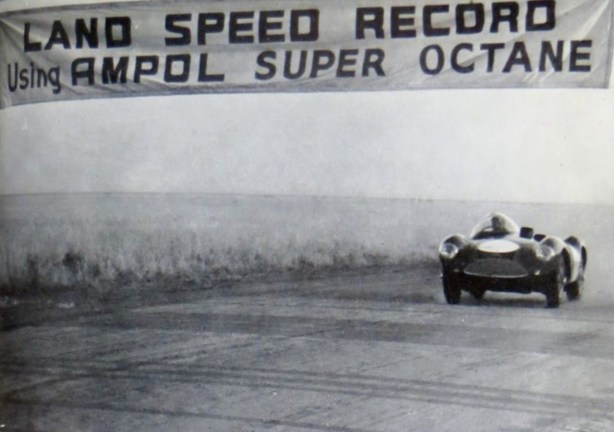 David McKay at speed during the Ampol sponsored record-breaking weekend in early 1957. Carrathool a tiny hamlet with now around 300 inhabitants. A straight, flat road with a decent surface a long way from major population centres was ideal record breaking territory! (Jek)