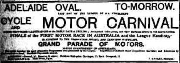Whilst not a car race but a ‘demonstration or parade’, what seems to be the first event of this type in Australia was held at Adelaide Oval on Saturday 11 October 1902. More interesting is that the first claimed motor-cycle race in Australia took place on the same day.