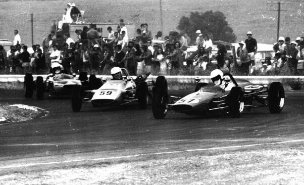 Brian Beasy, Beasy FF exiting Dandenong Road with a gaggle of cars including a winged F3 or F2 car. Decades later Historic Formula Ford in Australia would not have happened without the late Brian’s influence and guidance in the CAMS Historic Commission on all things related to FF inclusive of car eligibility (Beasy Family)