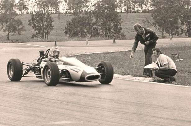 John Leffler, Australian Gold Star Champion in a Lola T400 Chev in 1977 and kneeling John Joyce trying to get their Bowin charges to apex correctly during the Oran Park Bowin test day in early 1975.