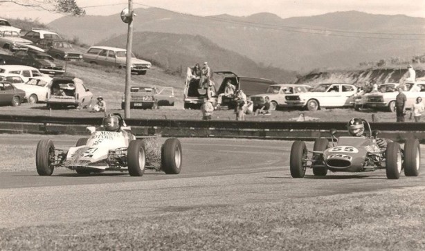 1976 Oran park P4A butt-shot, Quinn chasing Smith. Mk9 Hewland box, single top link, lower inverted wishbone, coil spring-/shocks and mechanic adjustable roll bar all period typical albeit by this stage a few rockers were starting to appear on cars such as the Royales and Lolas in Oz (Bennett)