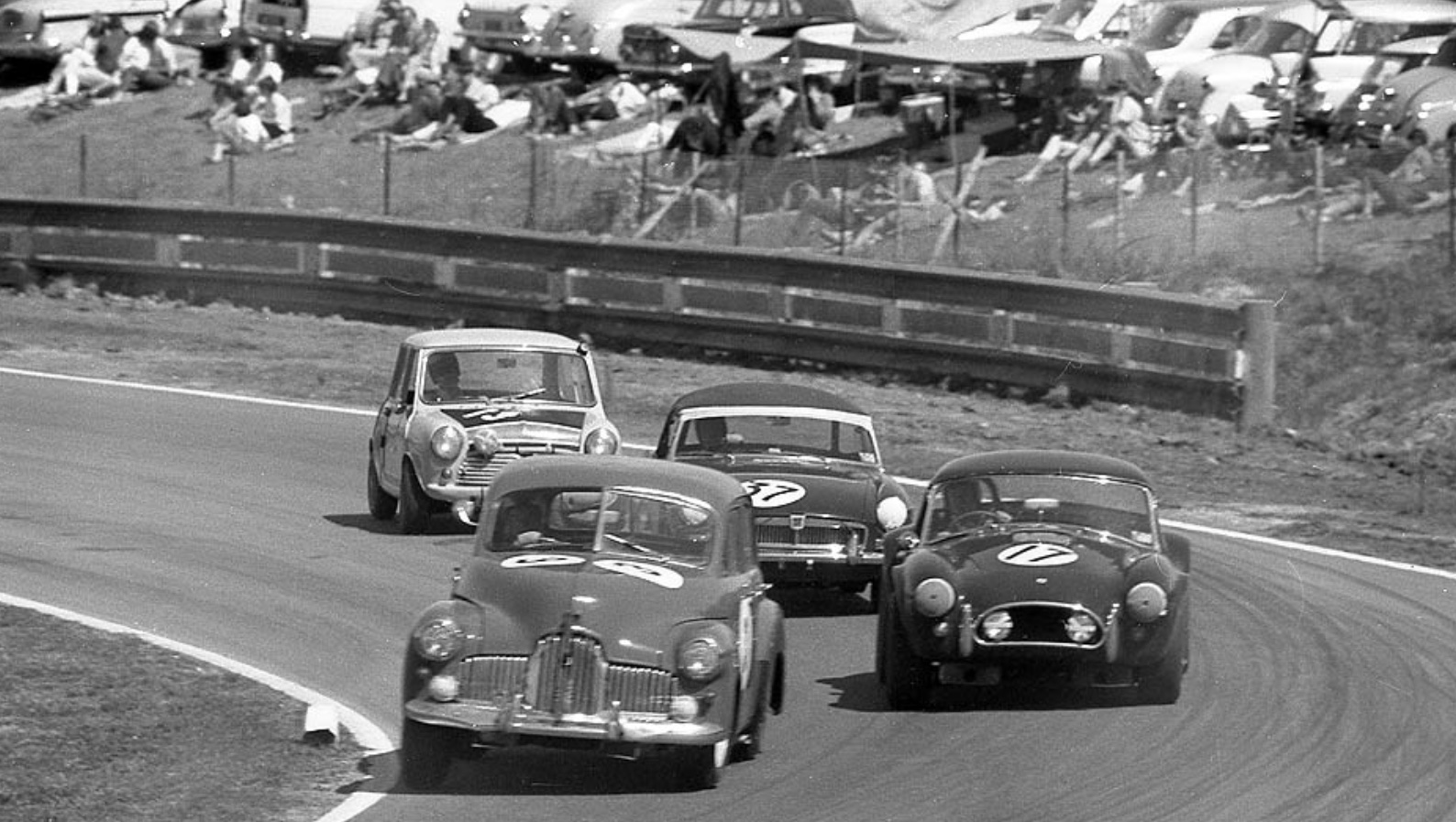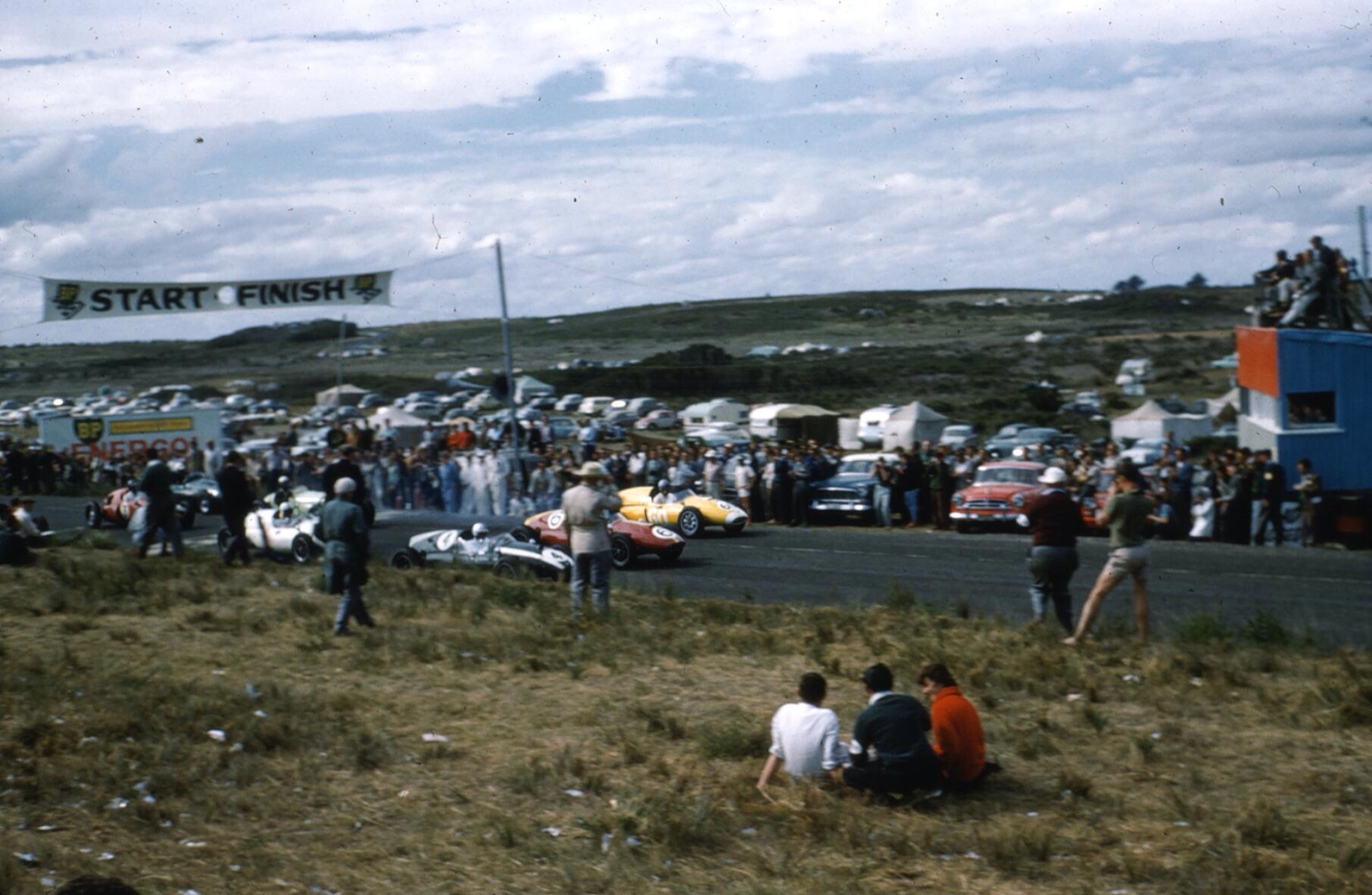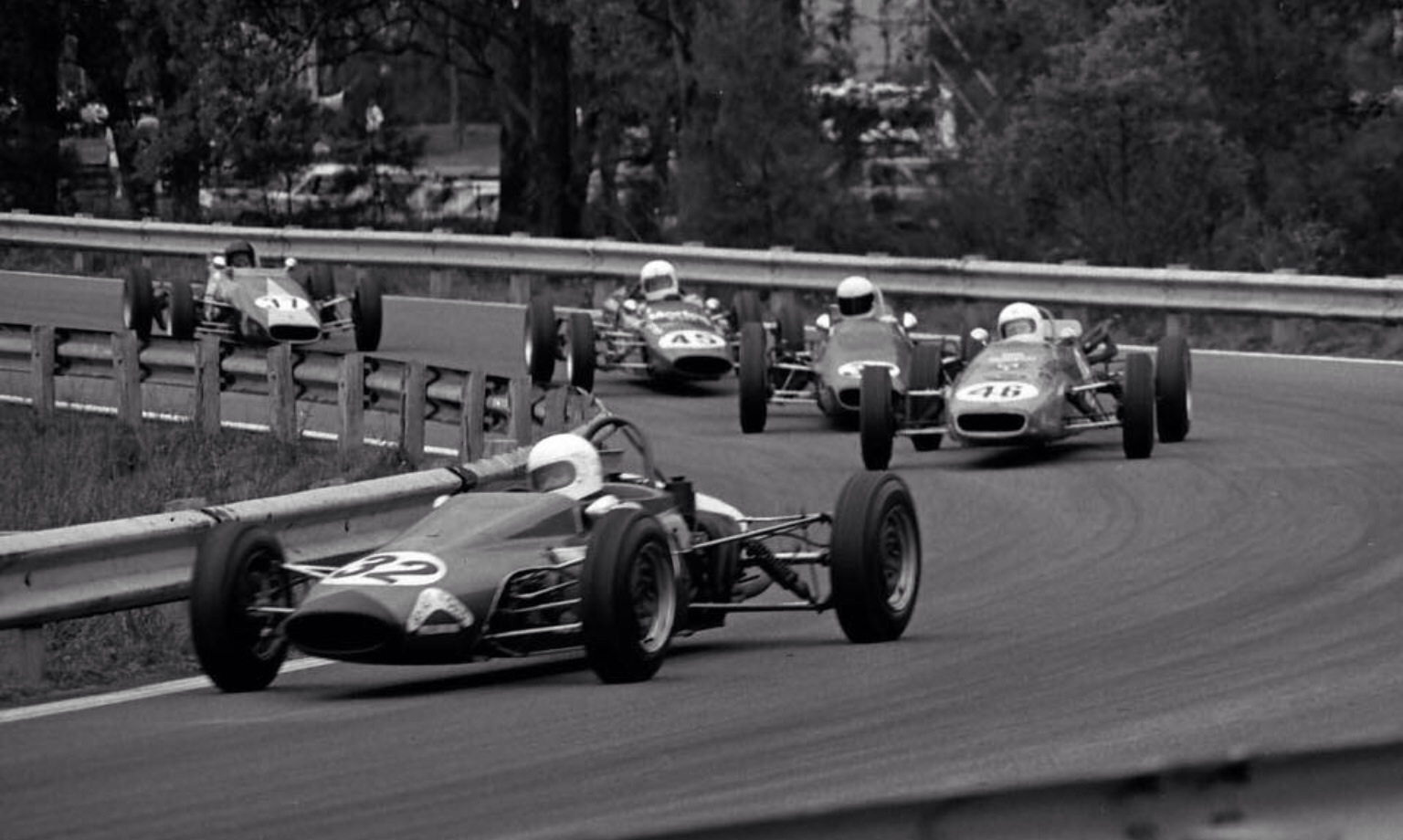 Brian Beasy, Beasy FF exiting Dandenong Road with a gaggle of cars including a winged F3 or F2 car. Decades later Historic Formula Ford in Australia would not have happened without the late Brian’s influence and guidance in the CAMS Historic Commission on all things related to FF inclusive of car eligibility (Beasy Family)