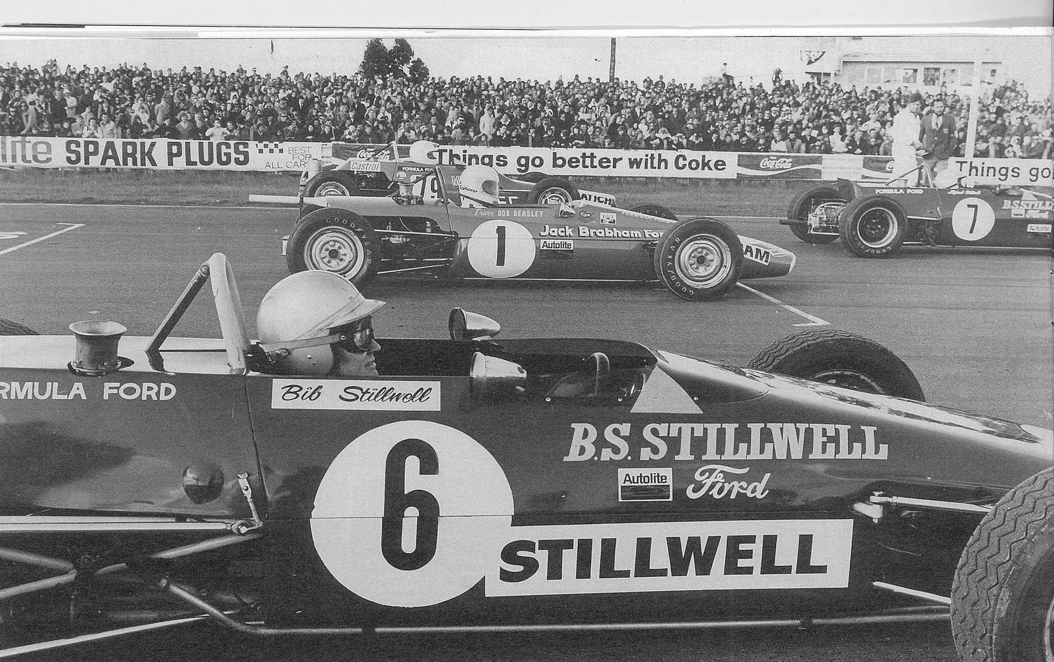 Perhaps the best credentialed of all Bowin P4 pilots was Australian triple world champion Jack Brabham in car #1!, the P4X raced that year with Jack Brabham Ford sponsorship by Bob Beasley. Jack won this 1971 Calder Park ‘Race of Champions’, his last event ‘in period’- he retired at the end of 1970 of course but could not resist appearing at this meeting- I wonder how much practice he did at Oran Park in this car?! Calder was not new to him- he tested his BT31 Repco Tasman machine at Calder on the day it’s assembly was completed in January 1969. The field for the ROC included Bib Stillwell #6, and Bob Jane #7, both in Stillwell Elfin 600’s raced that year by Larry Perkins and Mike Stillwell in the DTE Series, Frank Matich is alongside Jack with Allan Moffat, Kevin Bartlett and Alan Hamilton the other starters (Bennett)