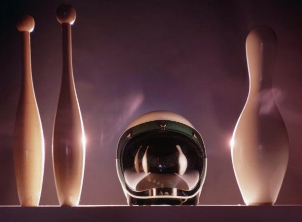 Still life of Indian juggling clubs, Bell helmet and a bowling pin…