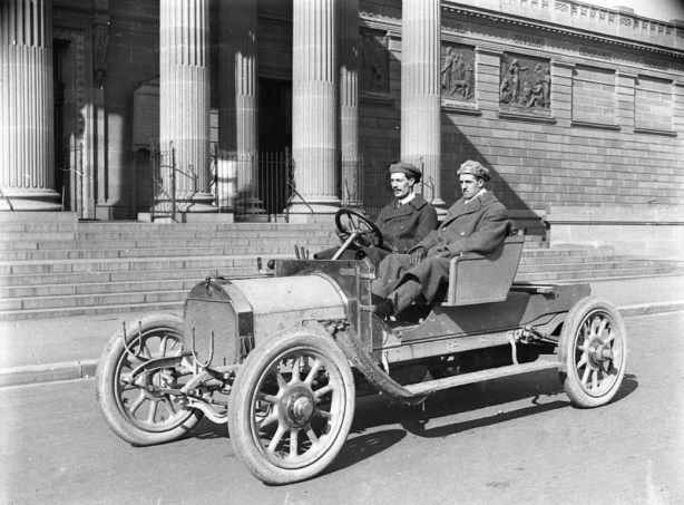 Two unknown men in a Vauxhall ‘possibly prepared for an Adelaide to Melbourne record run in 1913. The journey is 735 Km.