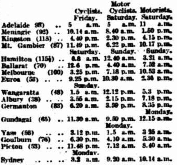 The cyclists performance was remarkable in that they’clung tenaciously to schedule hour after hour and were rarely more than 30 minutes either inside or outside of the timetable, while at Sydney they were just 4 minutes within the figures set for them’.