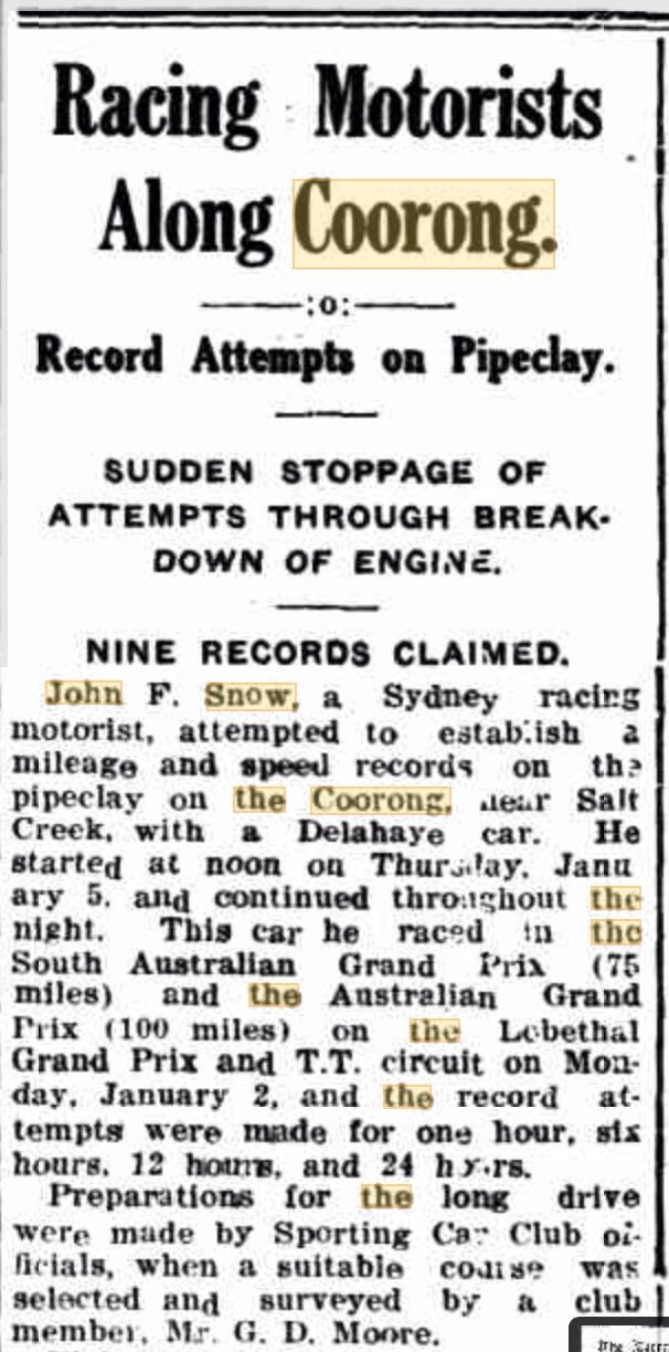 Bowman and Aunger made a cracker of a start for the ‘car team’, setting off from King William Street at 9 am on the Saturday morning, they ‘startled the motoring world, and the event organisers by driving from Adelaide across the Coorong Desert to Kingston (185 miles) in 5 hours 15 minutes.