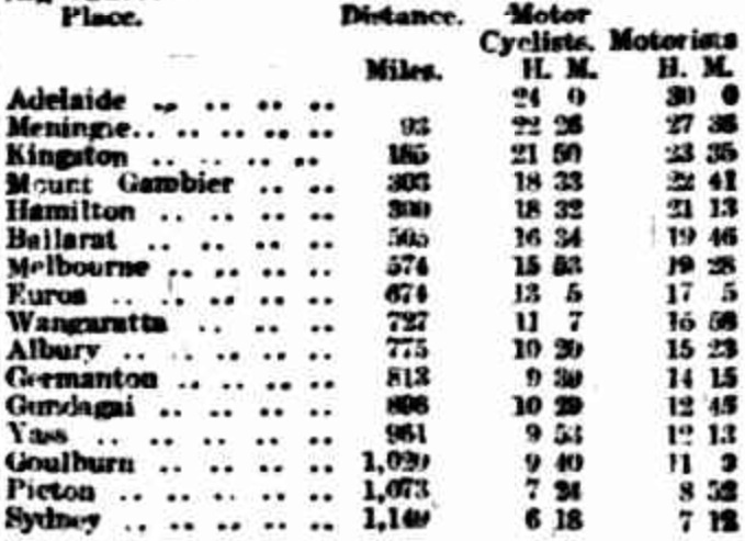 The motor cyclists were thought to be able to do the course in 46 hours with the cars needing to do the event in 40 hours ‘to come up level with the cycling divisions’. The car records at the time from Adelaide to Melbourne and Melbourne to Sydney were 20 hours 6 minutes and 19 hours 47 minutes respectively, a total of 39 hours 53 minutes so the automobilists had no easy task.