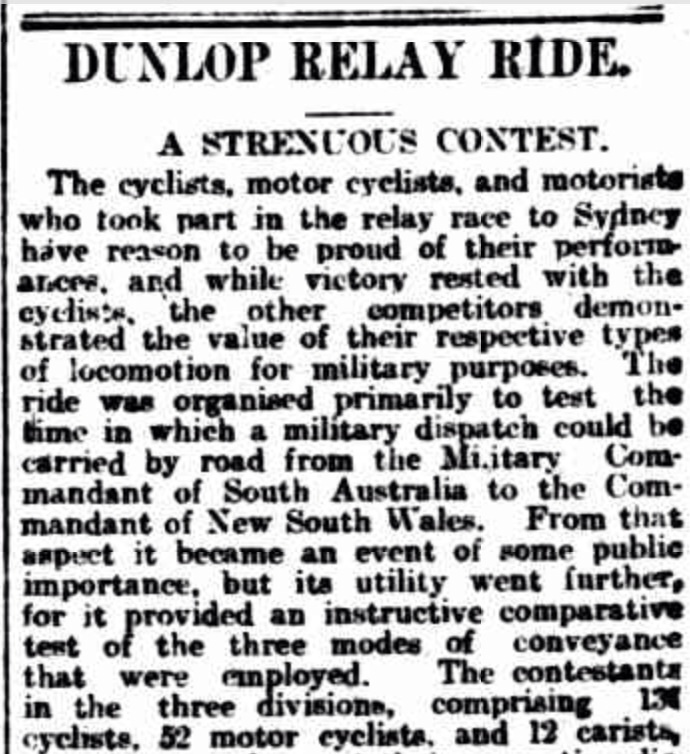 ‘No doubt the military authorities will be impressed with the reliability and effiiency of the cycles and motor cycles…One lesson to be drawn from the contest is the proved value of the three types of vehicles for military purposes…Given fair roads in this sprasely populated country, the value of the cycle and the motor vehicle in rapidly mobilising units is inestimable.