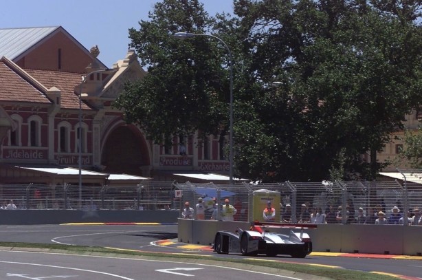 Frank Biela, R8 in ‘Banana Bend’ heading towards the Adelaide Markets, December 2000. Car retired after completing 170 of the winners 225 laps.