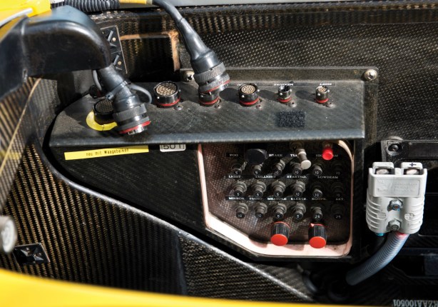 Chassis a carbon-fibre composite and aluminium honeycomb monocoque with the 3596 cc 90 degree V8 fully stressed. Suspension comprised double wishbones and pushrods with horizontally mounted coil spring/gas shocks. Steering, a power assisted rack and pinion. Disc brakes were servo-assisted, ventilated and cross-drilled carbon ceramic