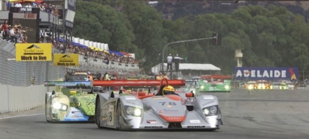 Allan McNish in the wonderfully distinctive ‘Crocodile’ livery Audi R8 ahead of David Brabham’s Panoz LMP-1, about to hook into the Adelaide GP circuit’s Chicane early in The Race of 1000 Years on 31 December 2000…