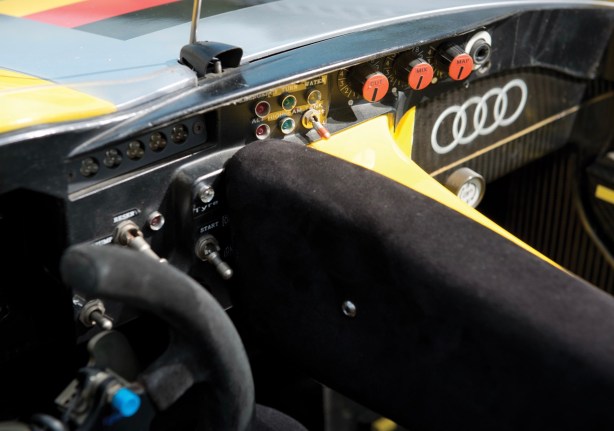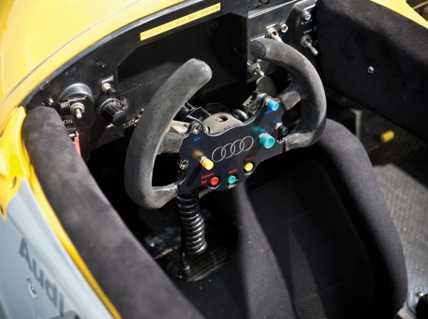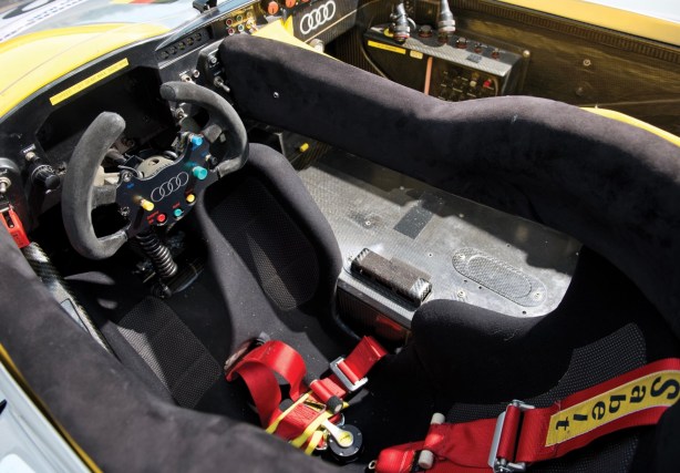 Audi R8 cockpit, driving position for a sports-racer somewhat unusal in being on the left, gearbox is Ricardo 6-speed sequential (D Schnabel)