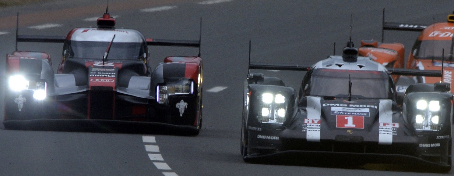 Timo Bernhard #1 Porsche 919 from Lucas Di Grassi Audi R18 during practice at Le Mans in June 2016. Below is the Fassler/Lotterer/Treluyer R18 Hybrid during the race, spectacular in the low light.