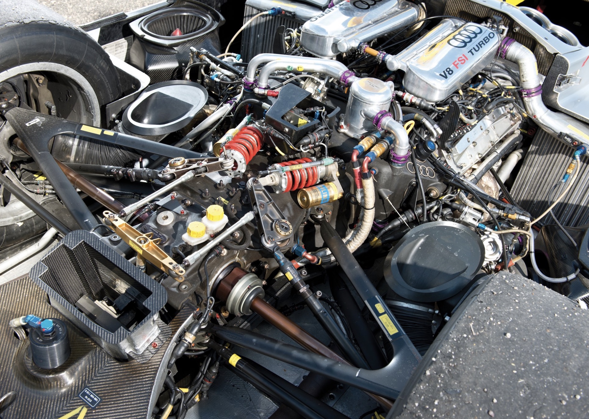 Engine Audi 90 degree all aluminium, DOHC, 4-valve 3586cc, Bosch-injected and twin turbo-charged V8 giving circa 610 bhp and above, 516 lbs/ft of torque. Gearbox, Ricardo 6-speed sequential.