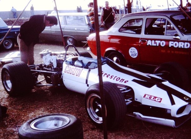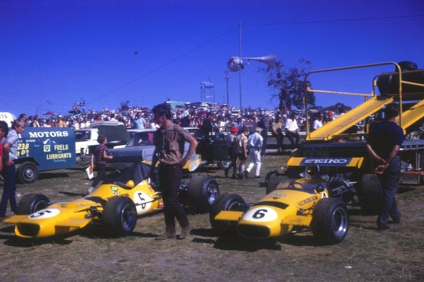 John Harvey ahead of one of the Elfin 600’s. Jane nee Rennmax Repco V8 – 830 Series V8. Bob Jane obtained the 830 V8’s used by Jack Brabham in the 1969 Brabham BT31- good works motors (L Hemer)