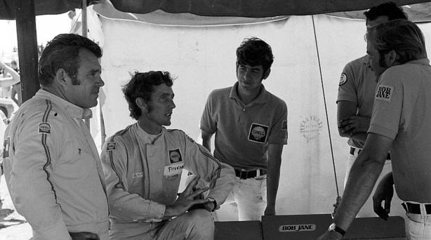 Bob Jane, John Harvey, a young Pat Purcell, ? and John Sawyer, side on during the 1970 Symmons round- car wing is BT23E (oldracephotos.com.au)