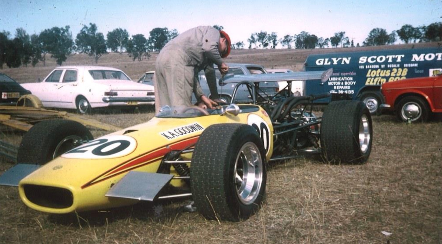 Ken Goodwin’s Rennmax BN3 Ford in the OP paddock June 1970 (K Hyndman)
