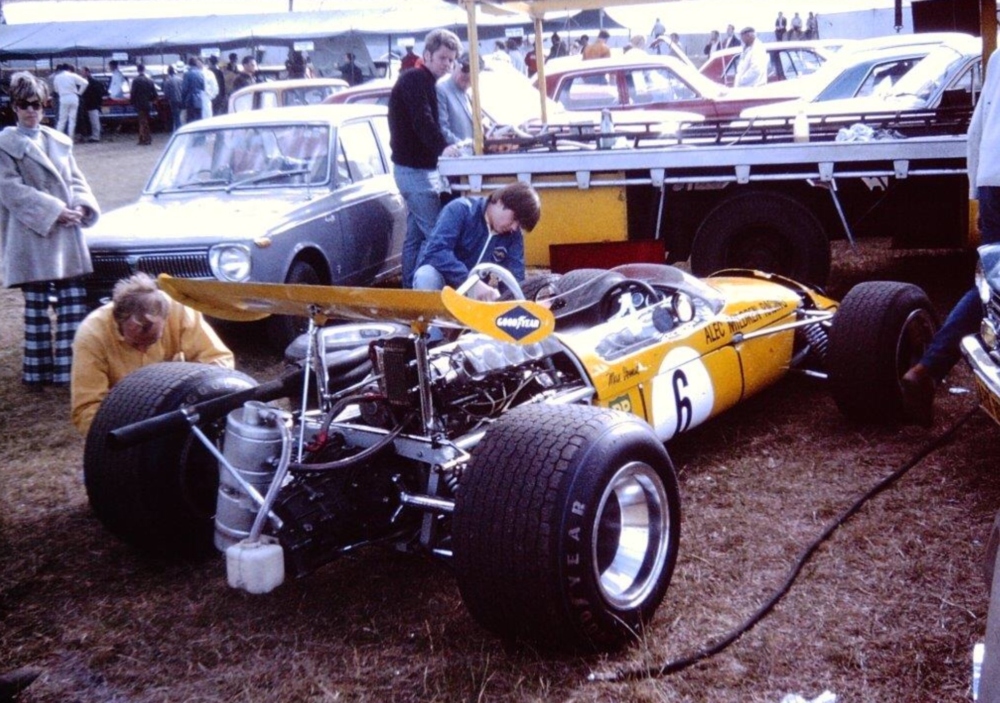 Bob Jane, John Harvey, a young Pat Purcell, ? and John Sawyer, side on during the 1970 Symmons round- car wing is BT23E (oldracephotos.com.au)