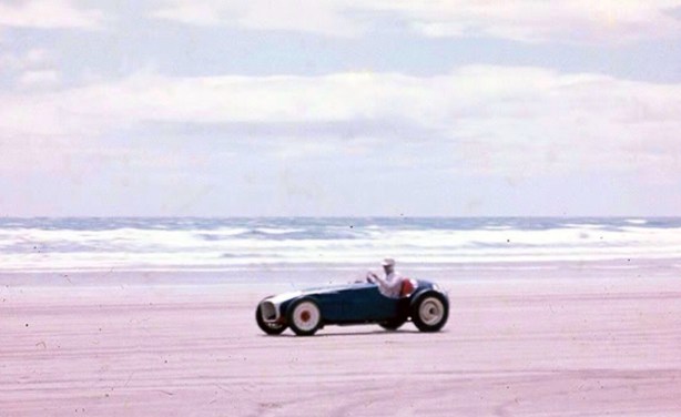 Bevan Wylie flat out in the Fiat Special at Brickmakers Beach, North Western Tasmania in 1959…
