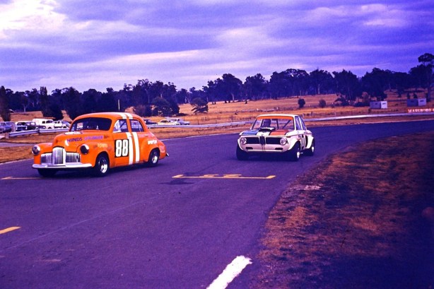 Michael ‘Moose’ Warner, Holden 48-215 leads Tony Edmondson, BMW 1602 Repco at Symmons Plains circa 1974…