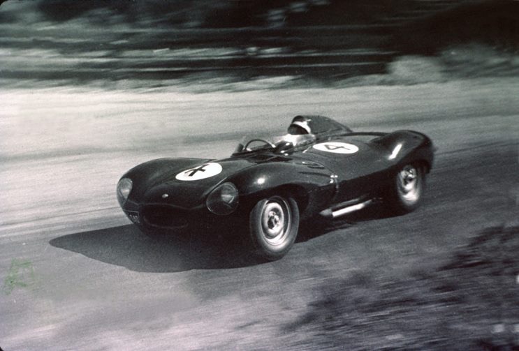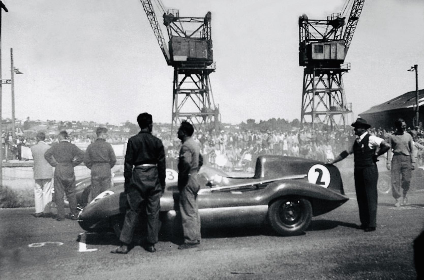 Bib Stillwell is in ‘XKD520’ on the left with Jack Brabham’s partially obscured Cooper Bobtail Climax far left, and Pitt aboard ‘XKD526’ on the right. To the far right is an Aston DB3S, Tom Sulman perhaps.
