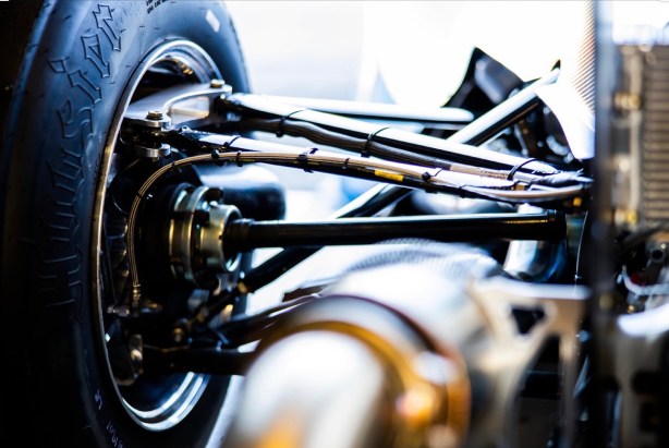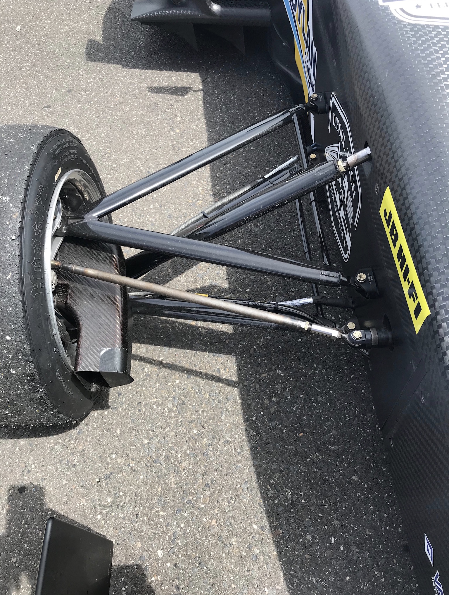 ‘001’ front suspension at Sandown in September 2019. AP calipers, cast iron rotors in keeping with cost-effective approach (Holinger)