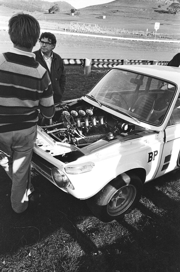 ‘Tony was only driving slowly, hence no helmet, in fact it was barely fast enough to get a speeding ticket in the Hobart CBD. They would do a couple of laps, return to the pits and scratch their heads, then do a few more laps. Eventually the cooling was sorted.’