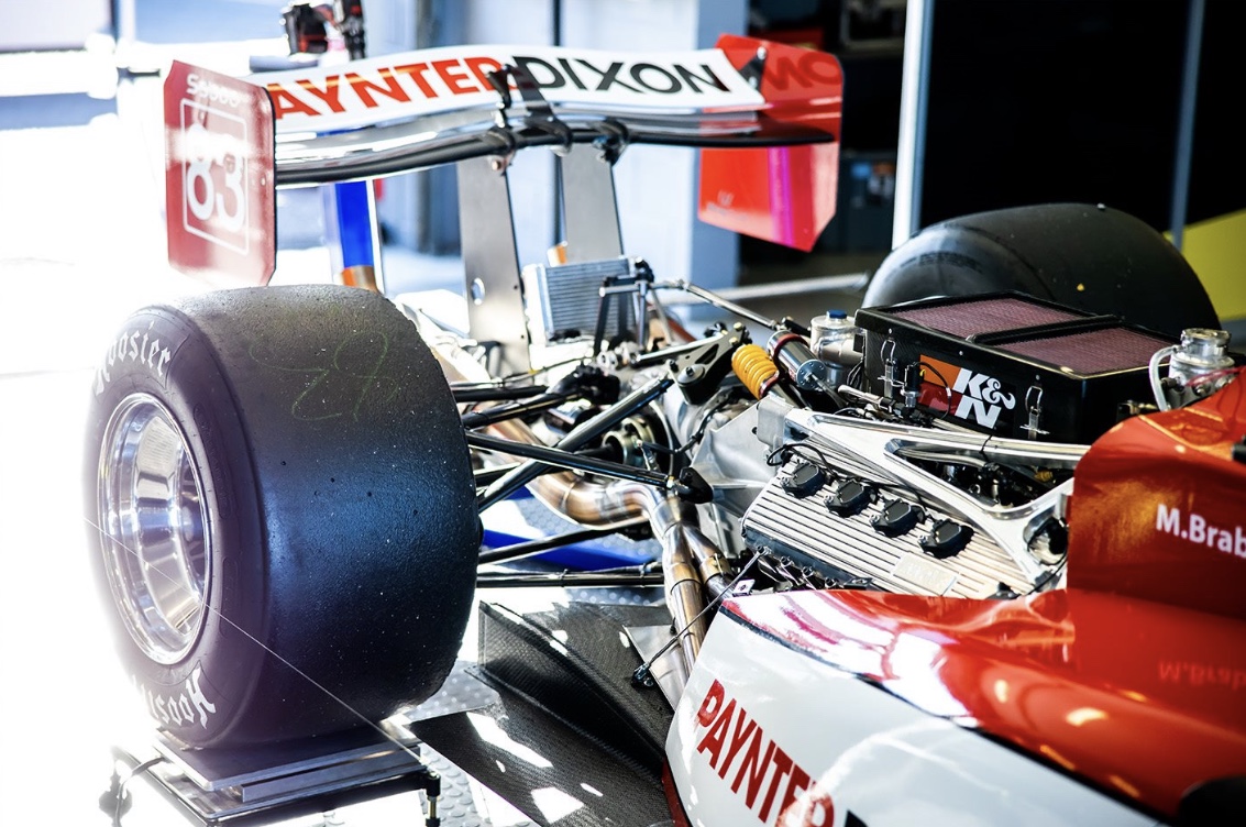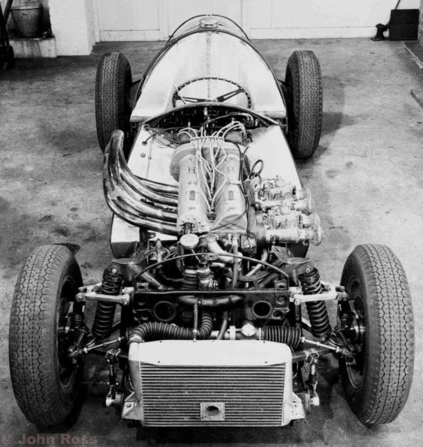 Note the Mawer Engineering wheels and ‘well back’ location of the engine. Intriguing to know the difference in weight between the cast iron block, alloy head BMW four and all alloy Repco V8.