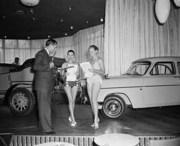 David McKay, babe and Aston Martin DB3S, Chevron Hotel, St Kilda Road, Melbourne 1958…