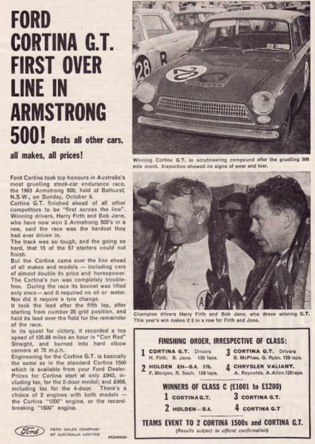 A valid addition to your list of “Tourers” that Jane owned would be the Ford Falcon XK with which he contested the 1960 Armstrong 500. Unlike the other Fords that he drove in the 500 from 1962 to 1967, this one was was entered by Bob’s “Autoland P/L”. The later cars were all entered under the Ford Motor Company banner. Who owned what I don’t know, so I am relying on the published “Entrant” details.