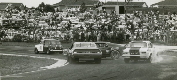 Re the “Ere we go again…” photo, that image was published with the Racing Car News report of the 1971 Sandown Tasman Championship meeting. Its caption doesn’t mention the Cooper S driver by name but the Official Programme has No. 10 in the Bill Patterson Holden Trophy – Heat 1 as Graeme Urch in a 1099cc Cooper S. RCN tells us that the Escort driver is actually Bill O’Gorman and that the car is just about to hit the fence. It seems the incident was the result of some confusion as Jane and Moffat lapped the Escort going into Dandenong Road Corner.