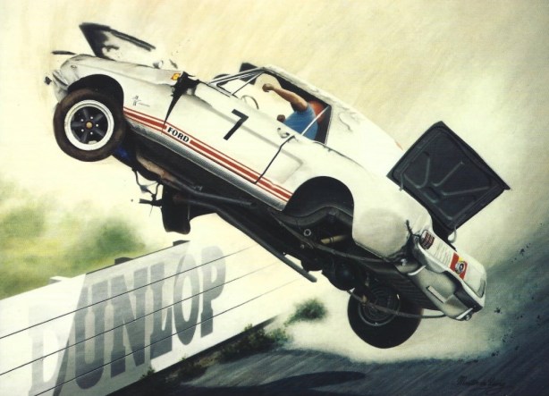 This series of paintings were commissioned of Martin de Lang to celebrate the fortieth anniversary of Bob and Harry Firth’s Ford Cortina GT, Bathurst 500 win in 1963. I’ve set them more or less in the chronological order Bob raced them, there were plenty more Jane owned racing cars than this though, check out the list at the end of the article.