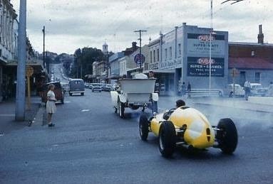 Lady at left seems pretty calm about the vivid yellow Cooper T51 Chev’s presence on the Launceston streetscape. Some type of car show or procession I guess- can someone help with the occasion and date?