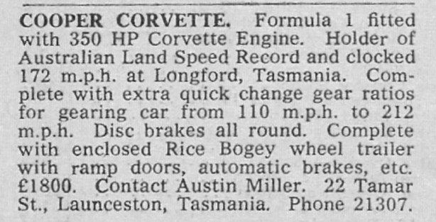 A friend of Aussie’s in Melbourne had just set a water speed record using a Corvette V8 engine. This engine was offered on loan as a starting point to our quest. The thought of stuffing 400 bhp of cast iron Chev into a petite Cooper F2 seemed almost as ridiculous as attempting the record itself.