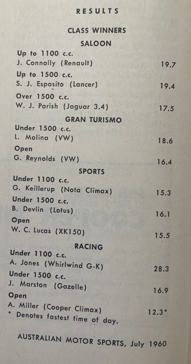 Speaking of Jones, Austin ran his Cooper at the Fishermans Bend Sprints on 5 June to get the final tuning of his T51 sorted for the Island the week later and who should be running on the same day but Alan Jones, ‘Following in fathers footsteps…he made a spectacular entry into open competition by cleaning up his young opponent in true G.P style, his mount- a Whirlwind go-kart powered by a 125cc motor mower engine…his time of 28.3 seconds after a push-start over the line wasn’t all that bad and it accounted for the under 1100cc racing class.’ I wonder if this is the first time AJ made it into a race report and results sheet? Now when did he start hill-climbing the Motor Improvements built Mini I wonder…