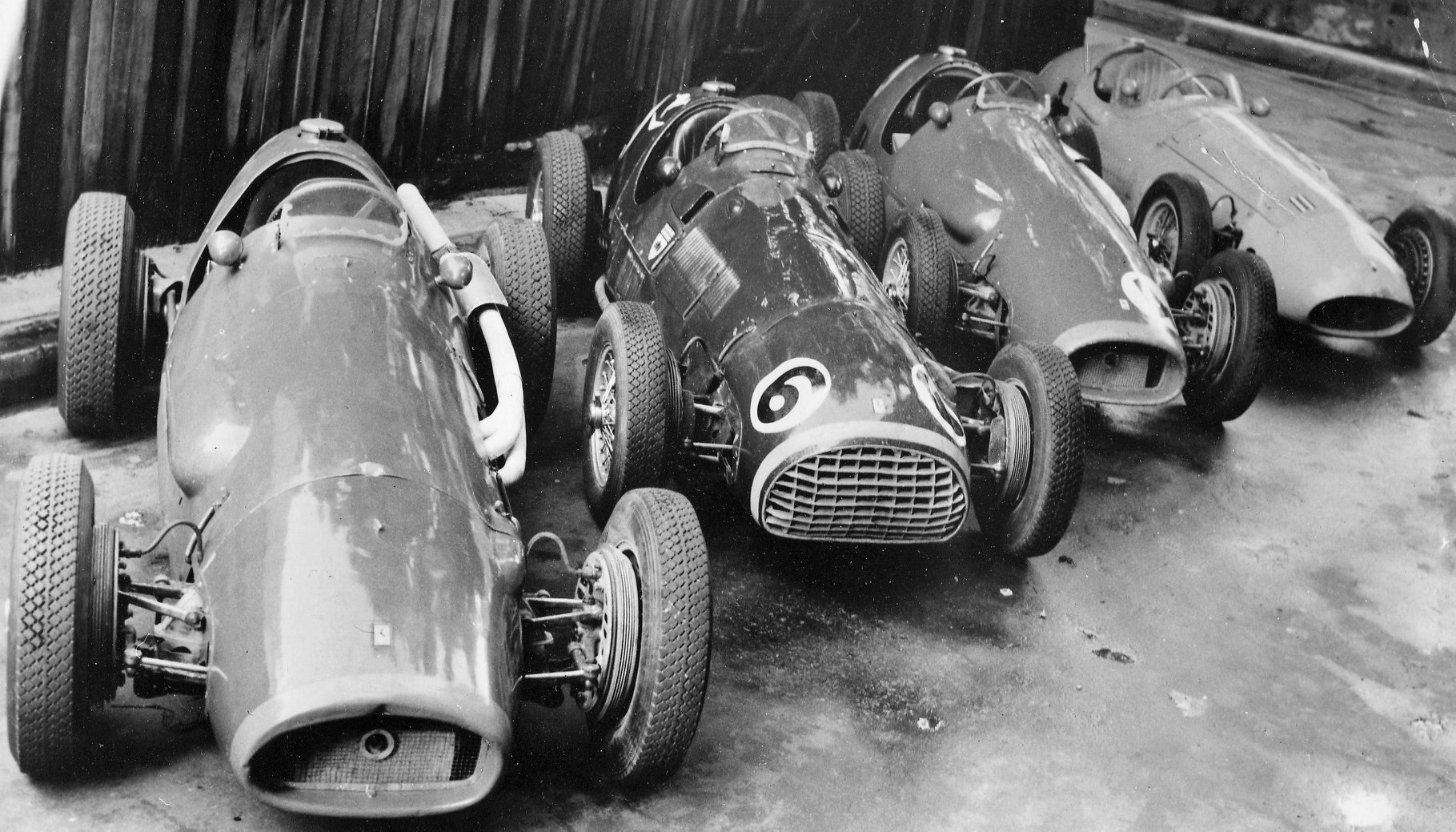 Longford Trophy paddock March 1960, Brabham won in a Cooper T51. Austin topless, Cooper T51 2.2, Arnold Glass Maser 250F and Alec Mildren’s Cooper T51 Maserati (R Lambert)