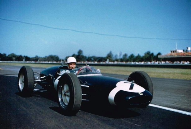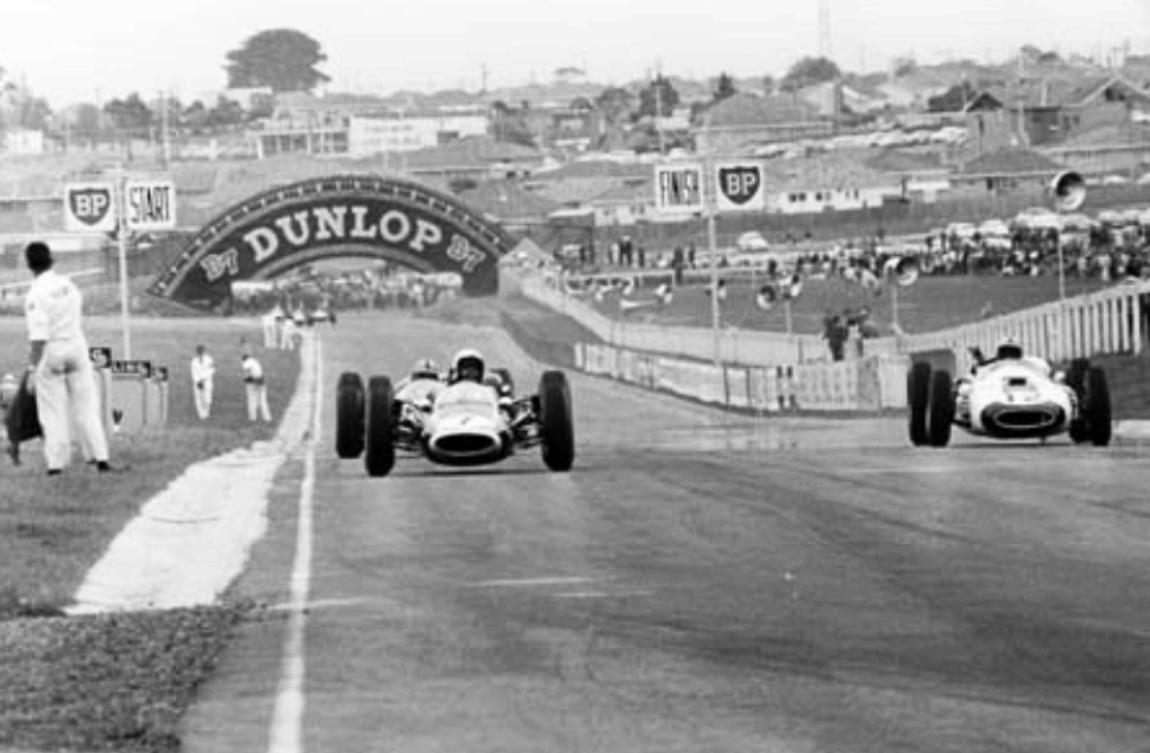 Austin strolls with his T51 Climax the wrong way up Sandown’s Main Straight from the old paddock onto the grid for the start of the feature race at Sandown’s first meeting on 12 March 1962, the ‘Sandown Park International’. Brabham won is his 2.7 litre Cooper T55 Climax- Aussie DNF in the Chev engined T51 (unattributed)