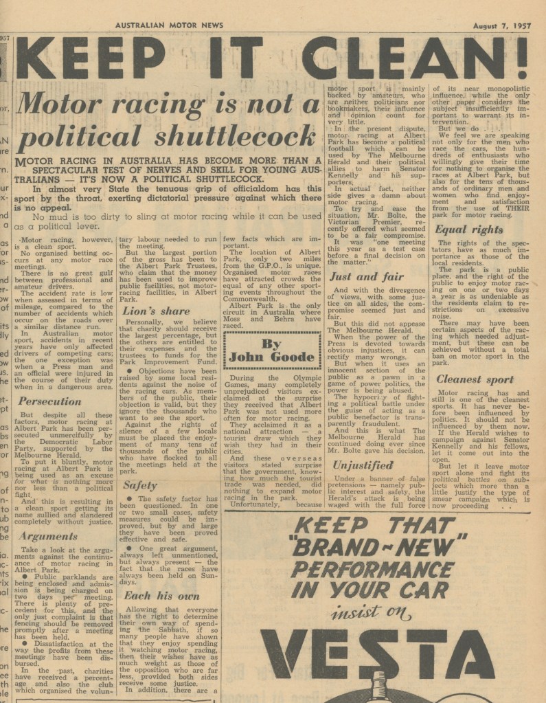 None of our events at the time resembled those in Europe, we had no specialist motorsport governing body- the Confederation of Australian Motor Sport (very recently re-named Motorsport Australia) was formed in the mid-fifties. Racing decisions prior to the CAMS existence were made by the Competitions Committee of the Australian Automobile Association, an organisation of each states automobile peak body or club, each of which were naturally primarily concerned with everyday motoring/motorists needs.